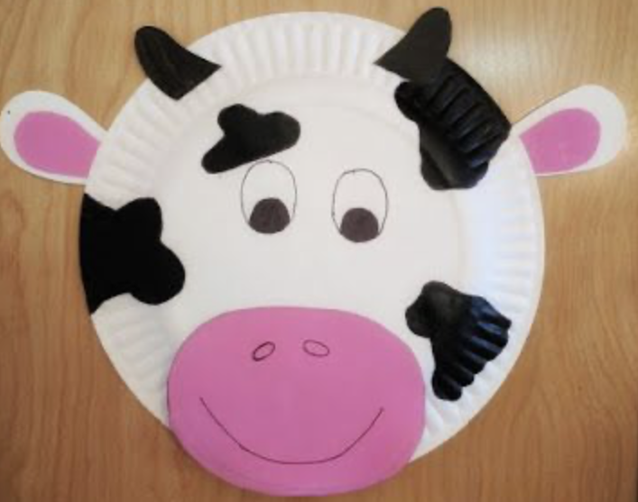 Help your child to cut out a big oval for the cow’s mouth and 2 little ones for ears out of pink construction paper, 2 white ovals bigger than the pink ones, as well as 2 black ovals for horns and 4-6 pieces out of black construction paper. Draw eyes with marker and glue all pieces together on the paper plate. You might want to staple the ears too.