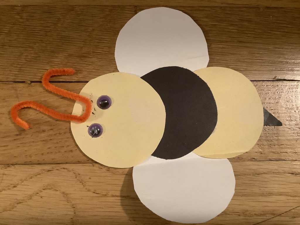 Help your child to glue the circles together, the eyes, and the antennae out of pipe cleaner. Oh, don’t forget the stinger at the end of your bee!