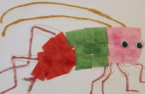 Help your child glue the squares of tissue paper and the eyes. Use markers to trace feet and antennae.