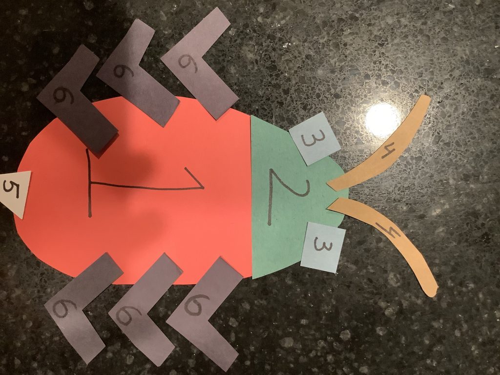 For this Roll A Beetle math game, you need a dye and beetle body parts in construction paper. Each number you roll will give you a beetle body part. If you roll:
