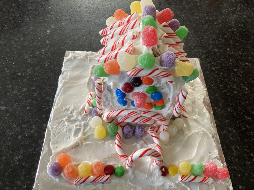 5. Once your house is built, cover with white frosting and decorate with candy, as well as the space around your house.