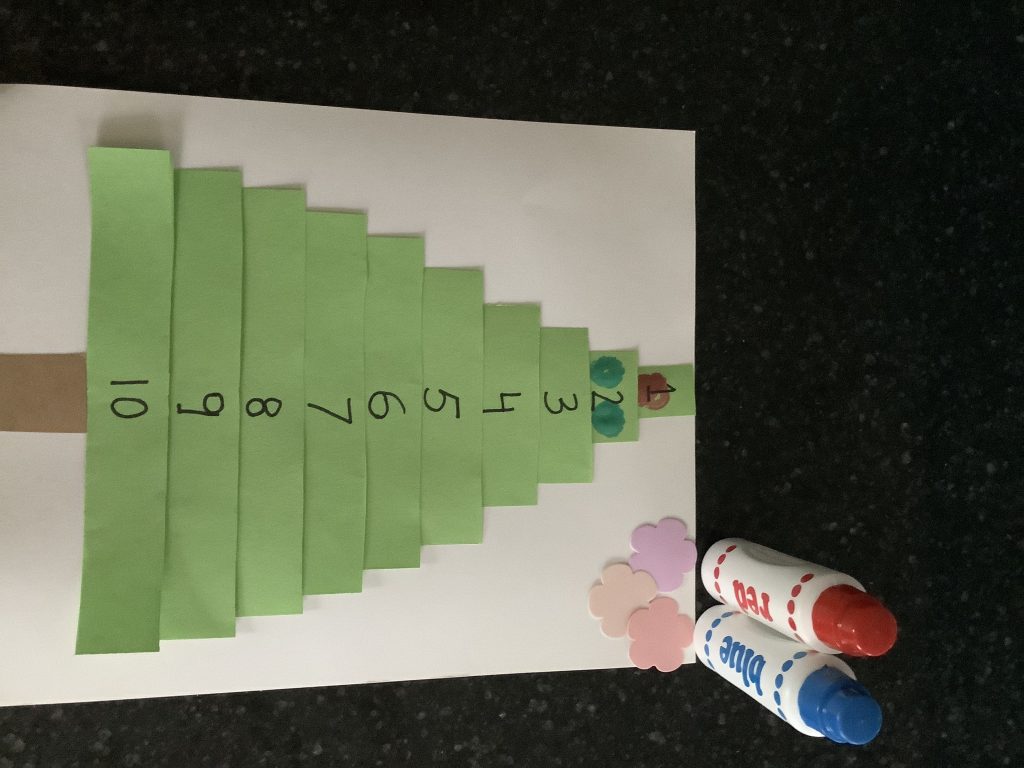 3. Glue your tree on blue construction paper and write number 1-10 on strips of green construction paper: number 1 on the smallest strip,…..