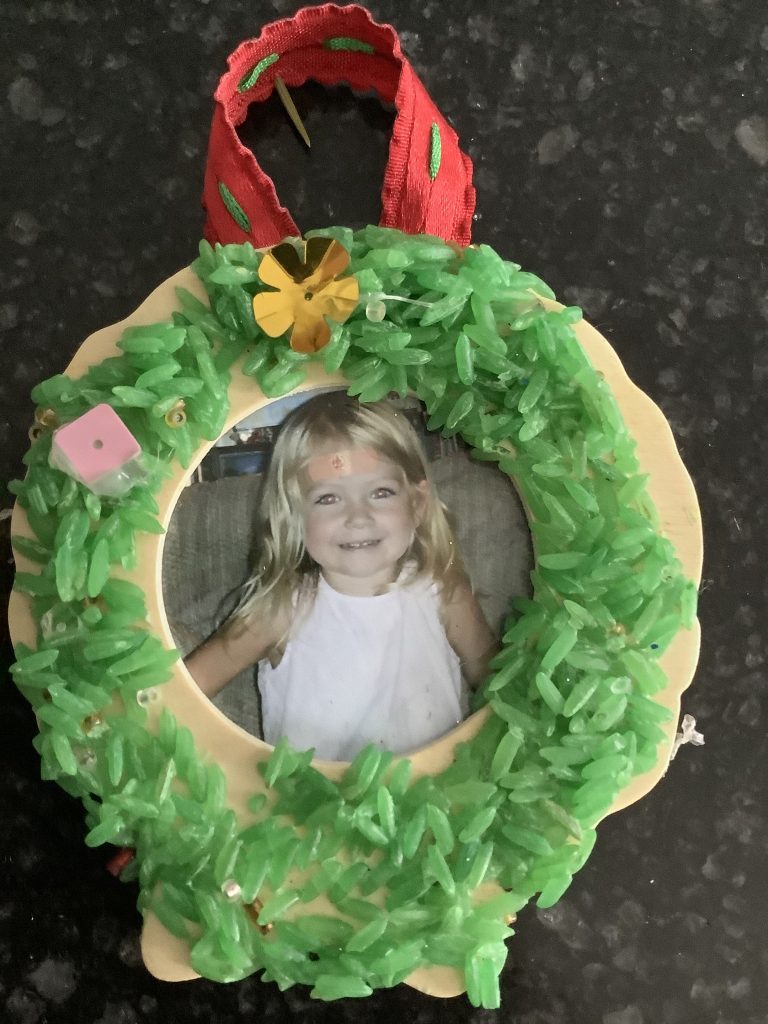 For Picture Ornament Art Project, you need (1) picture of your child, (2) glue, (3) wooden frame (or cardboard circle painted and cut), (4) colored rice, (5) piece of holiday ribbon, (5) felt, (6) little decorations, and (7) black marker.
