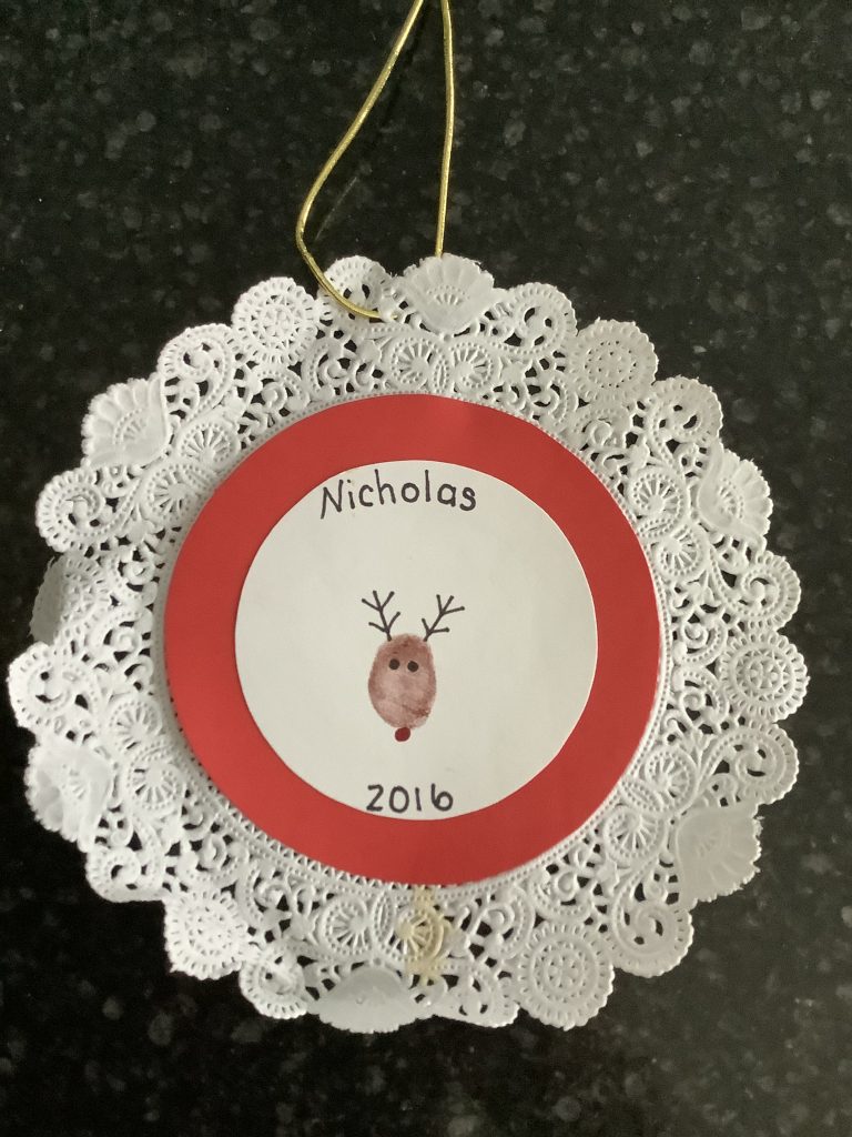 For simple Doily Fingertip Reindeer Ornament Art Project, you need (1) small white doily, (2) white and red construction paper, (3) scissors, (4) glue, (5) black and red markers, (6) brown tempera paint, and (7) holiday ribbon.