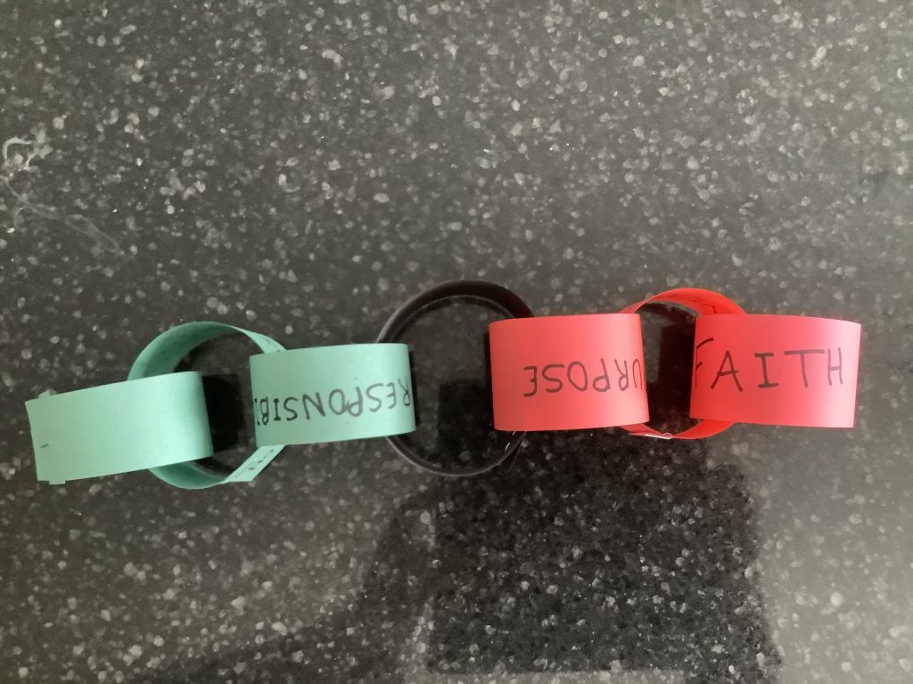 2. Staple bands of color in a loop inside each other to build a chain. Your child can do the Kwanzaa Kinara pattern: green, green, green, black, red, red, red.