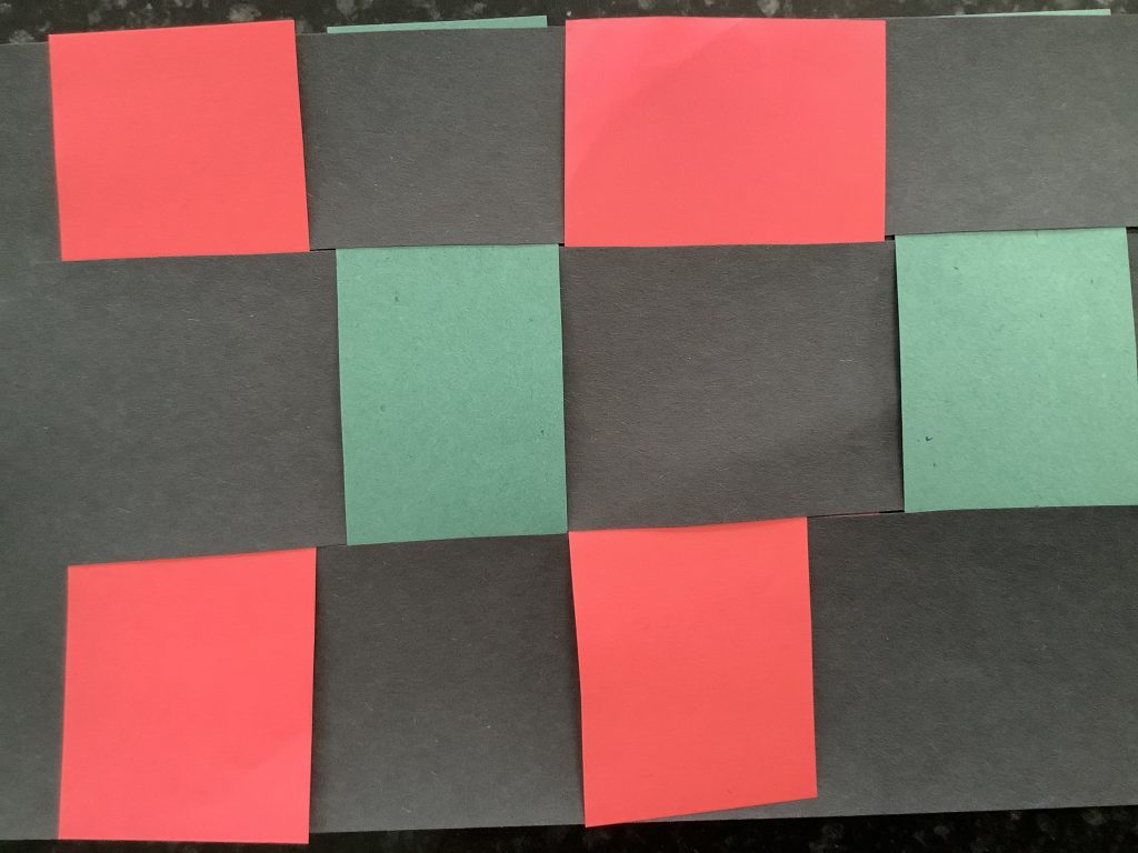 4. Use the bands of red, green and black to construct a Kwanza Kufi style hat.