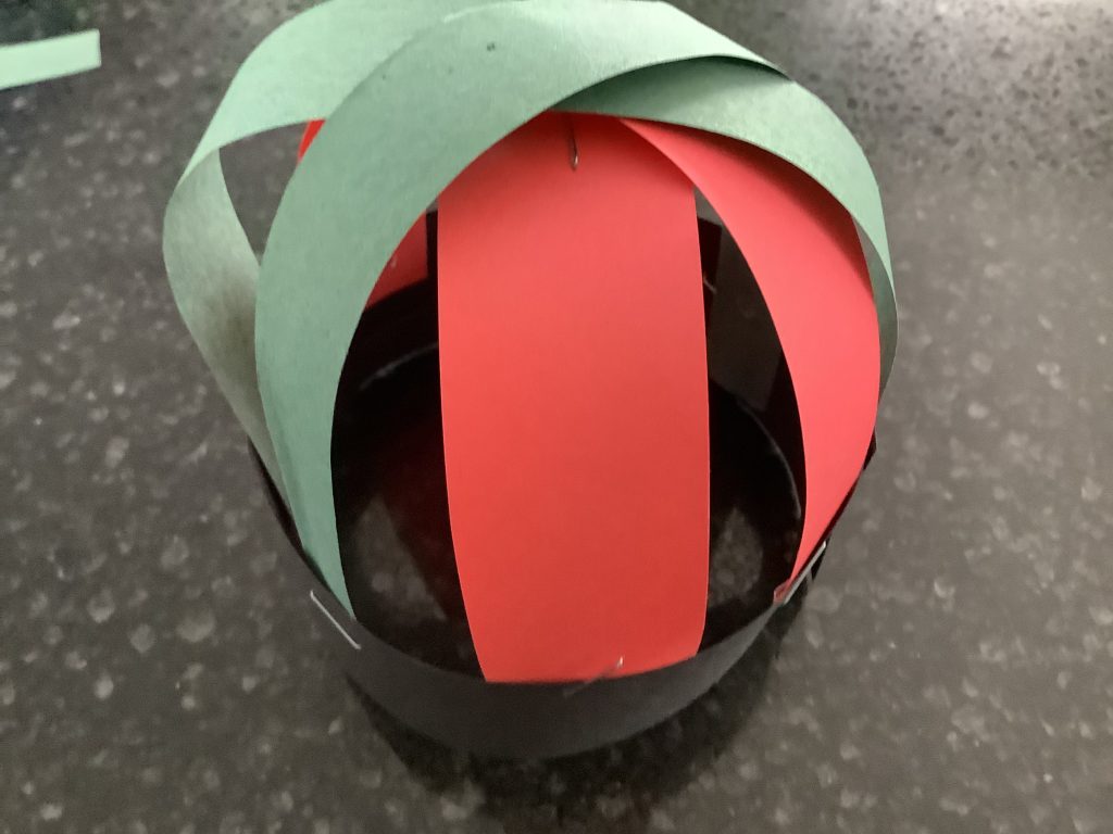 1. Cut bands of red, black and green construction paper.