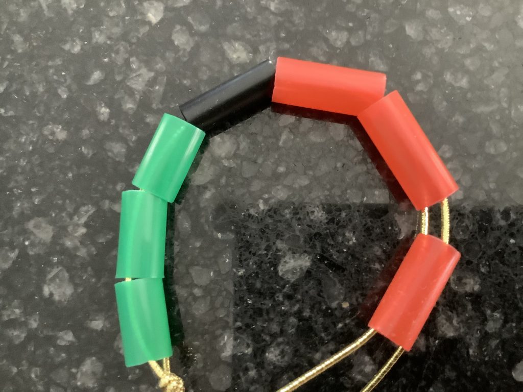 4. With a black pipe cleaner and red/black/green beads/colored straw pieces, your child can build a Kwanzaa bracelet to wear or put around plastic wine decorated cup.