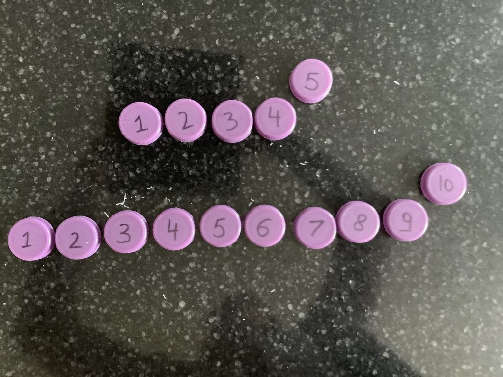 As a special math activity, you need (1) five or ten (advanced – 20) milk caps/cotton balls (more advanced) and (2) marker. First, write number 1-5 (early learner), 1-10 on caps (or 1-20 for advanced) and arrange them in a line from 1-5, 1-10 or 1-20. Second, take cap no. 5, 10, or 20 away and ask your child how many are left. Your child will say 4, 9, or 19 depending on the original number. Repeat the exercise until there is no caps left. For more advanced practice, line up cotton balls 1-5, 1-10, or 1-20, take one away and ask your child how many are left. This activity will show if your child understand the value behind the number word.