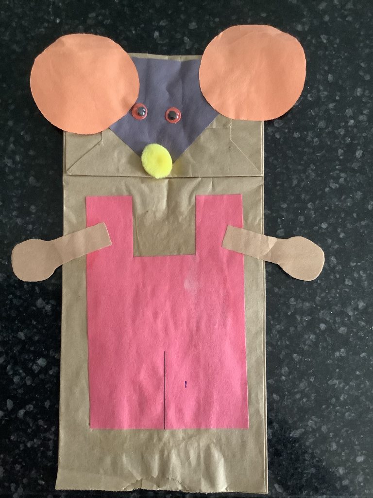 For the Mouse Puppet Art Project, you need (1) brown paper bag, (2) brown, red, orange and black construction paper, (3) 2 googly eyes, (4) 1 small pompom, (5) glue, and (6) a black marker.