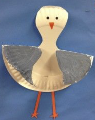Help your child trace the seagull’s head and cut around it and fold the wings. Have him/her paint the wings grey, use the black marker to color the eyes and the orange to color the beak. Cut the pipe cleaner into two and shape feet and legs or cut legs/feet out of orange construction paper.