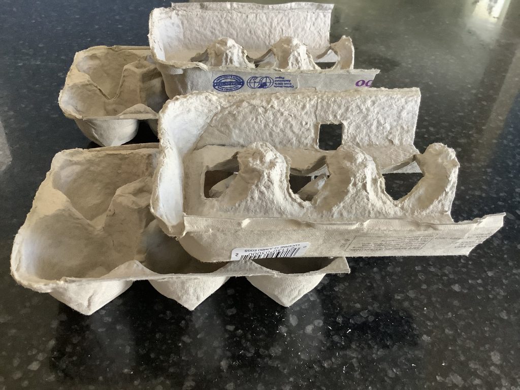 For Egg Carton Dump Truck Art Project, you need (1) egg carton (makes 2 trucks), (2) hot glue (adult only), (3) scissors, (4) tempera paint or markers, (5) bottle caps or black construction paper circles for wheels, (6) plastic egg for driver (draw a face with marker).